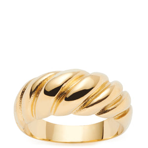 Absolut französisch, dieser golden ionenplattierte Edelstahl-Ring! Der sich nach unten verjüngende Domring ist mit einer auffälligen Croissant-Struktur versehen und schmückt die Finger von Frauen auf eine durch und durch stilvolle Weise.